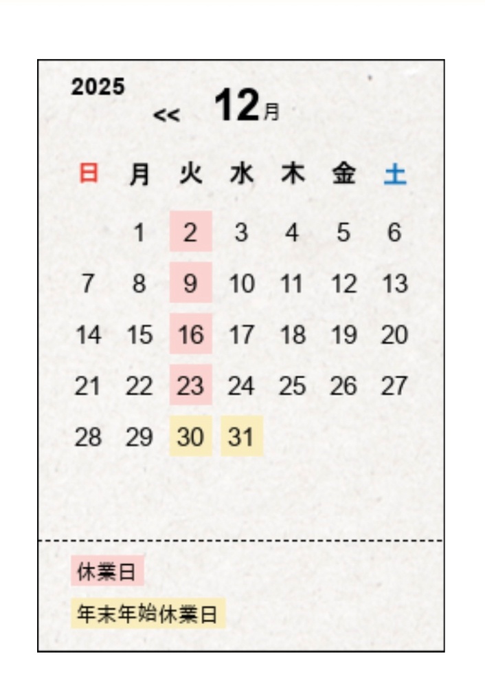 12月の休業日は以下の通りです。