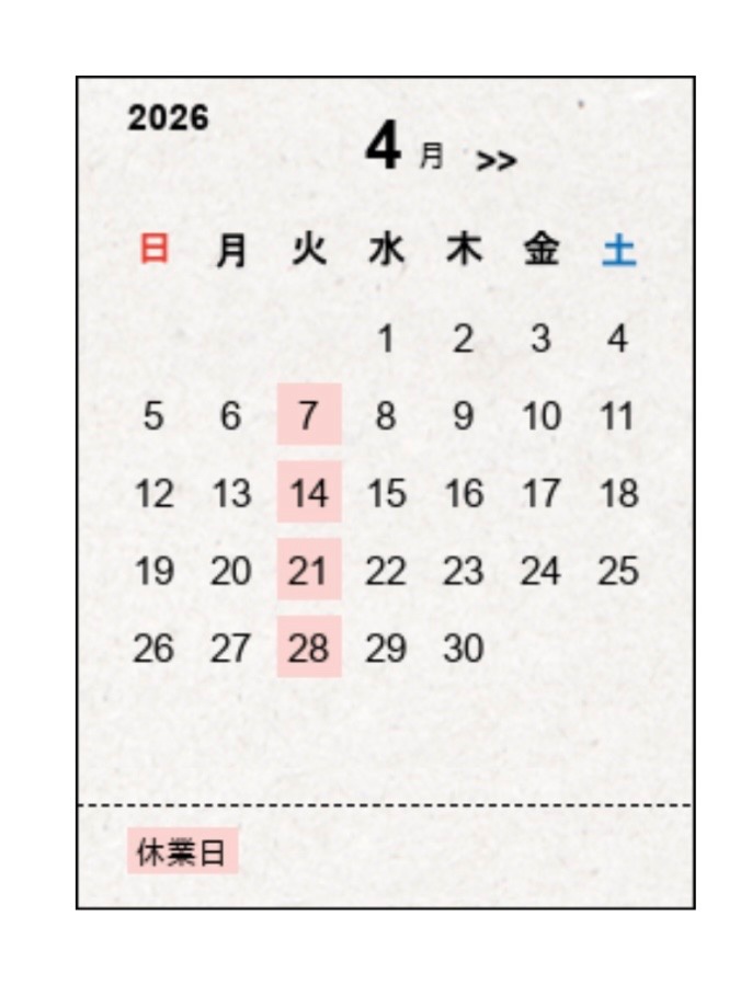 4月の休業日は以下の通りです。
